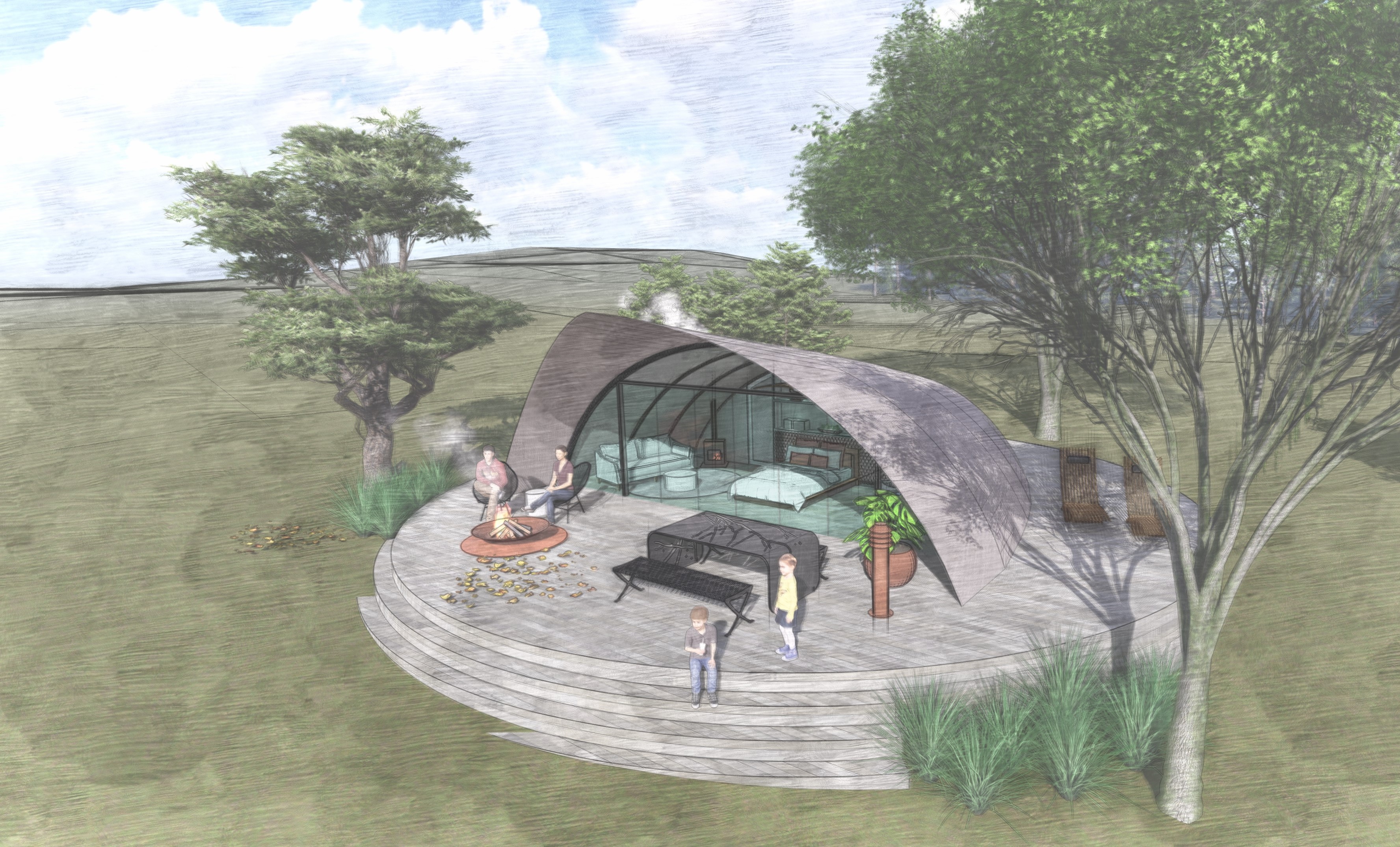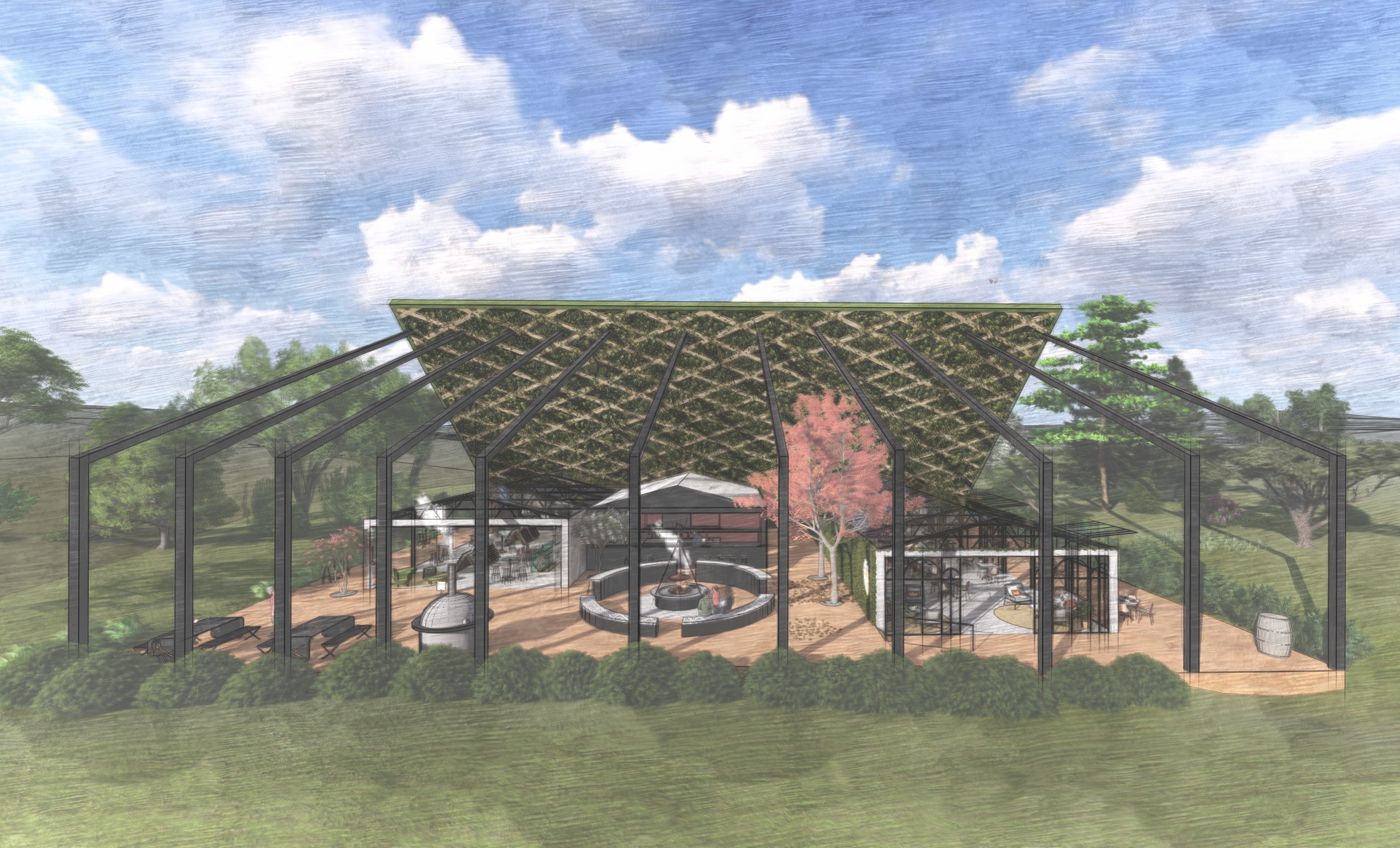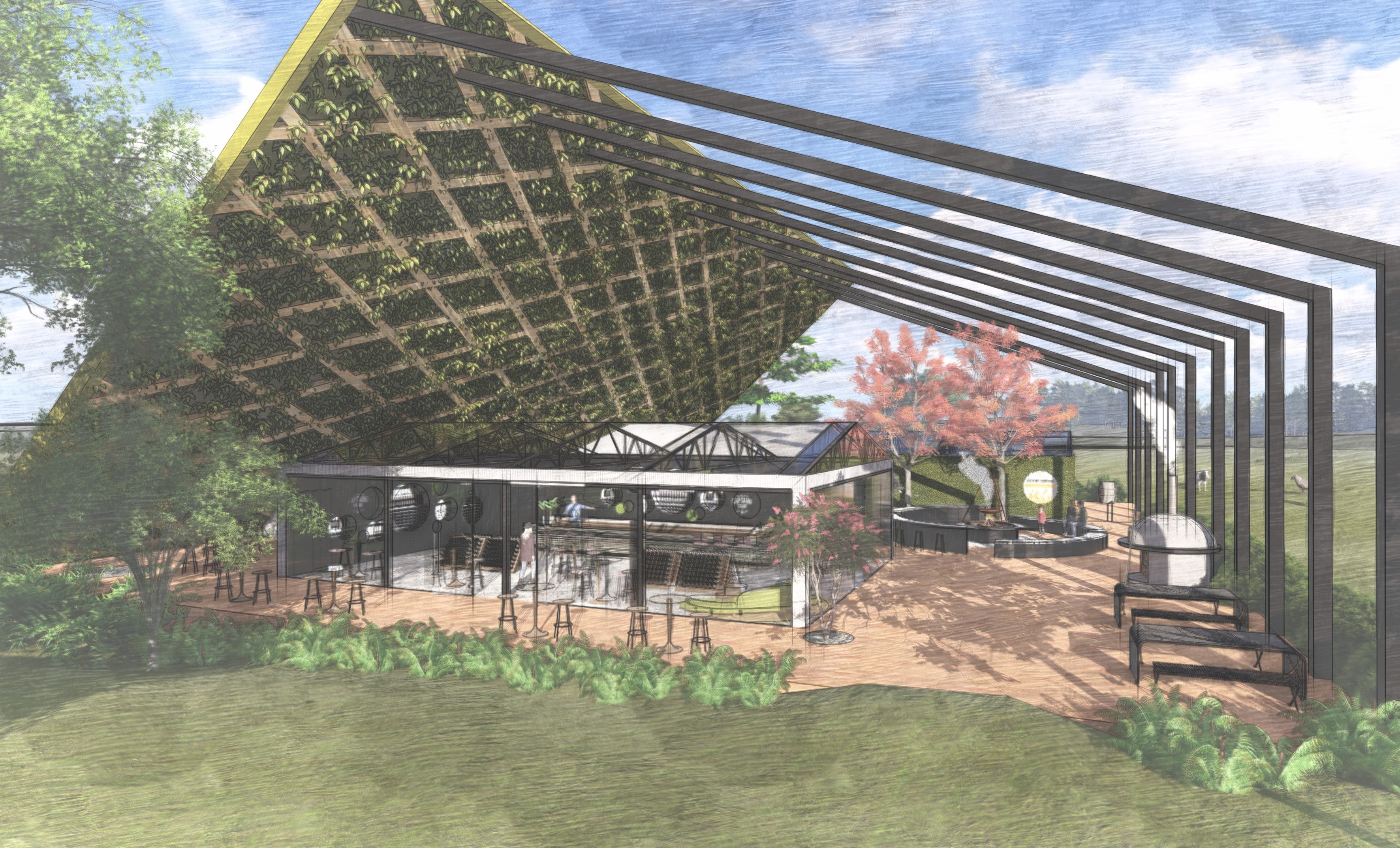 The key to the design is based on adapting the space to suit a broad target market as well as the weather conditions. The turfed roof provides a windbreak from the southerly winds to ensure guest comfort, whilst providing that wow factor within each of the spaces. The glass roofs provide a connection to the surrounding landscape and are designed to slide open for ventilation with roller blinds fitted to provide shade.