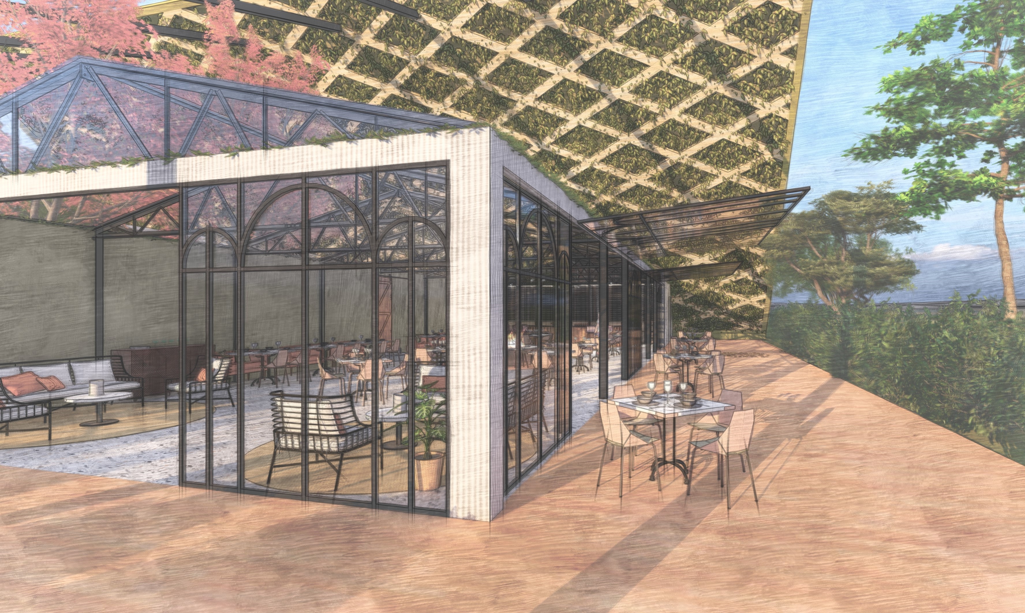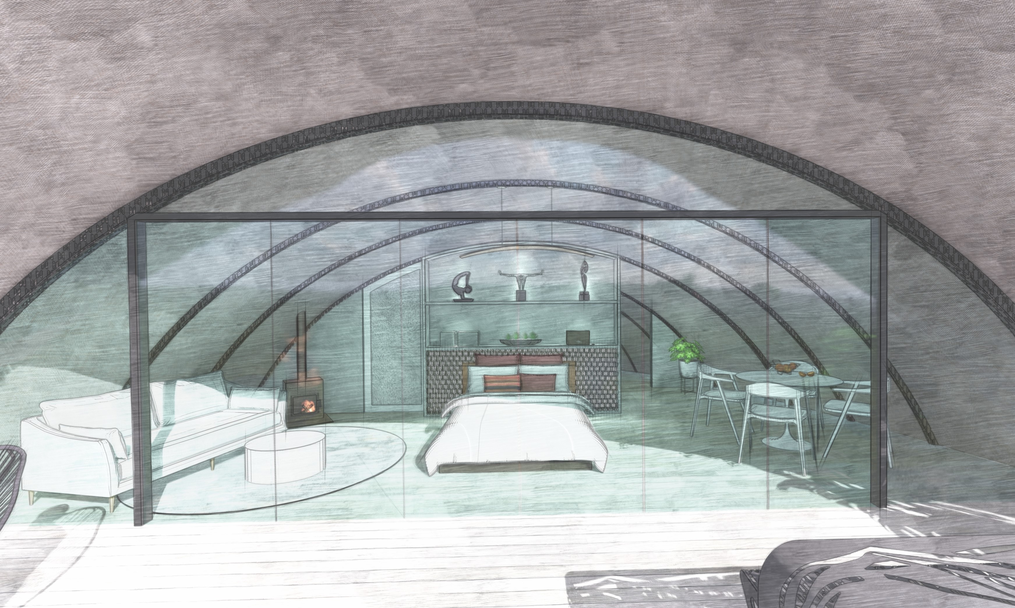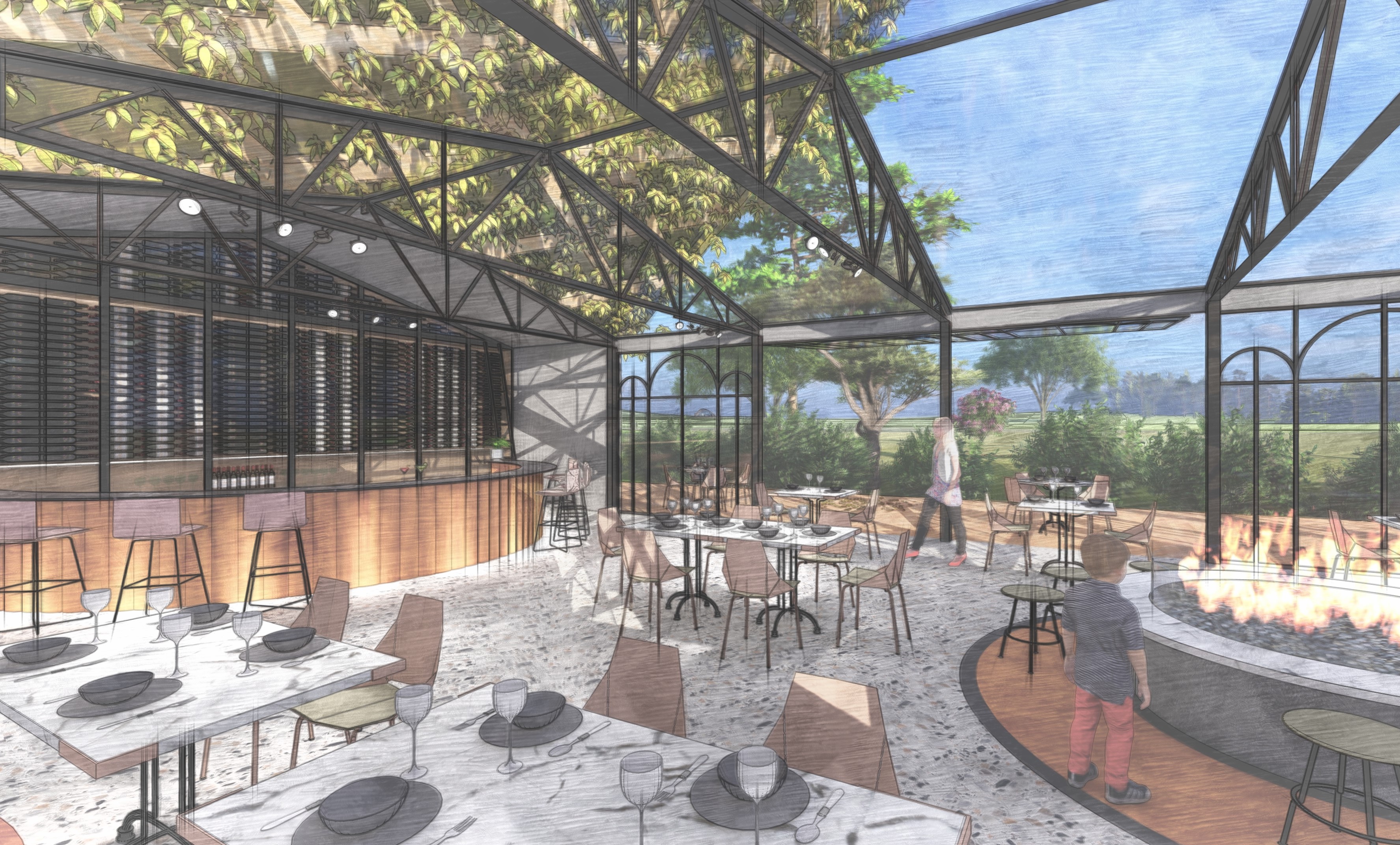 The key to the design is based on adapting the space to suit a broad target market as well as the weather conditions. The turfed roof provides a windbreak from the southerly winds to ensure guest comfort, whilst providing that wow factor within each of the spaces. The glass roofs provide a connection to the surrounding landscape and are designed to slide open for ventilation with roller blinds fitted to provide shade.