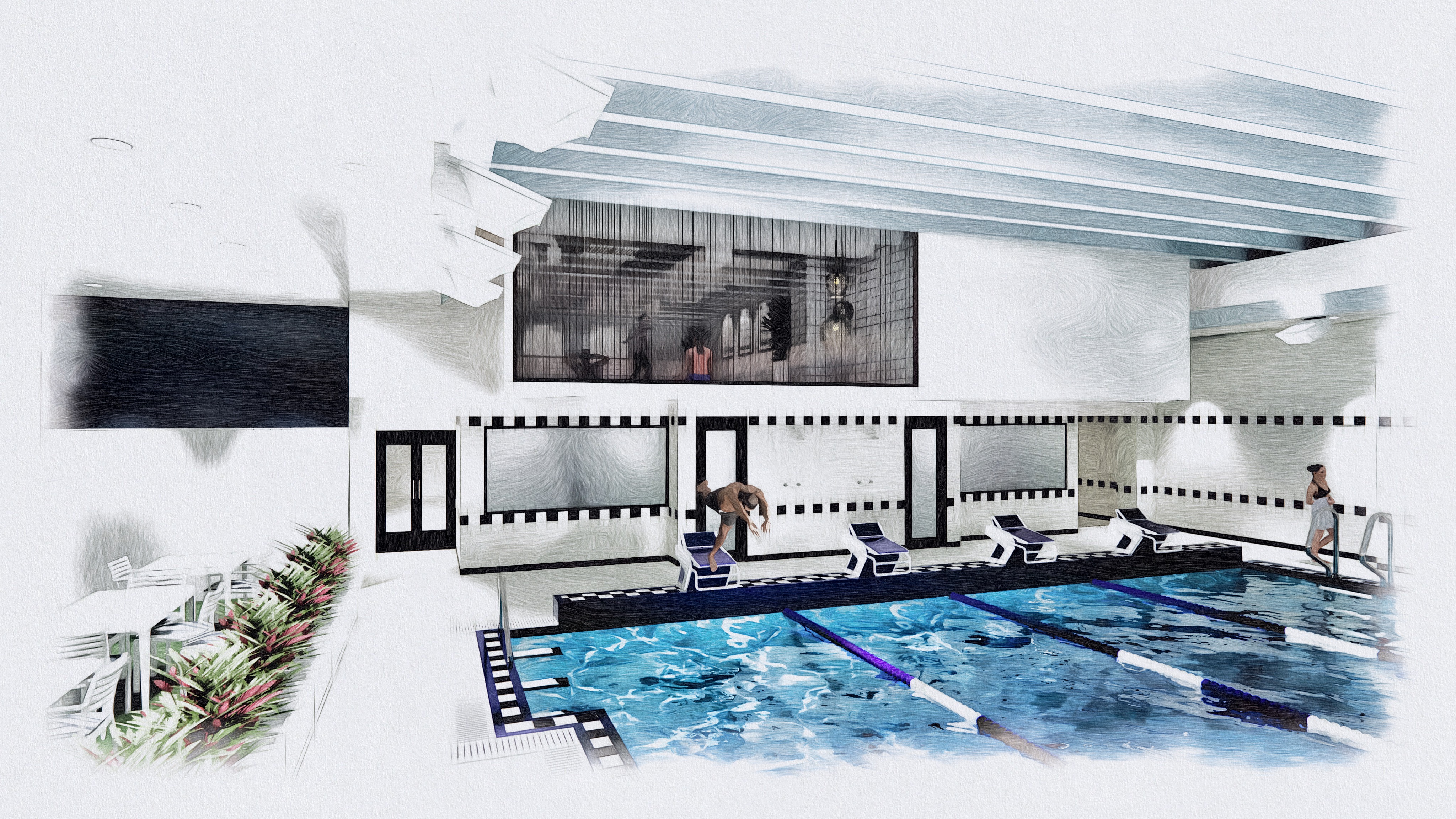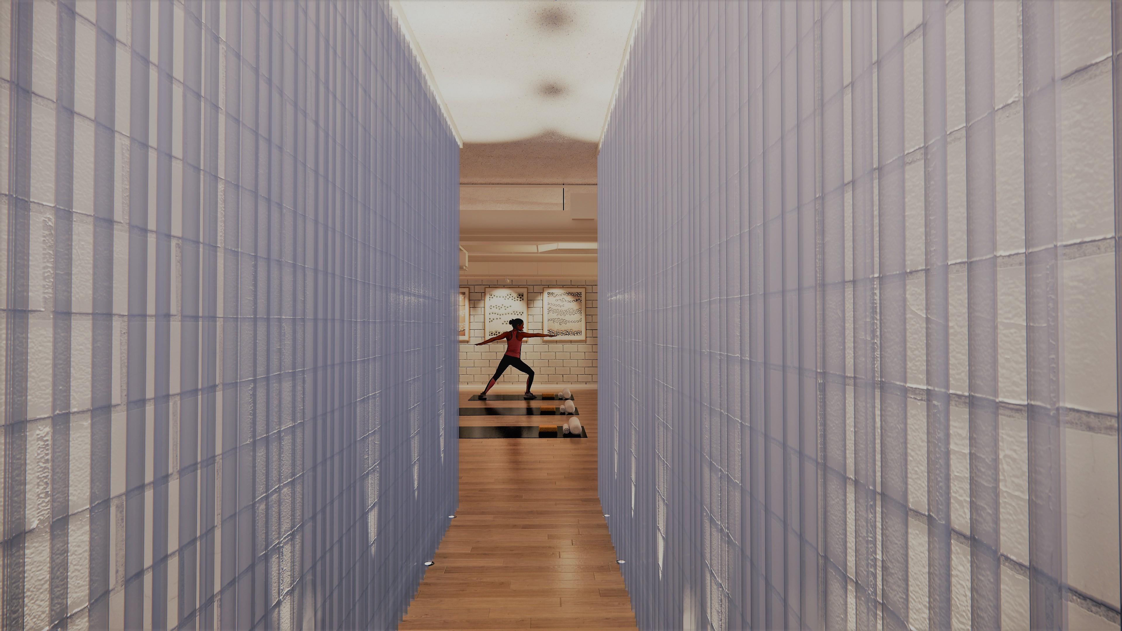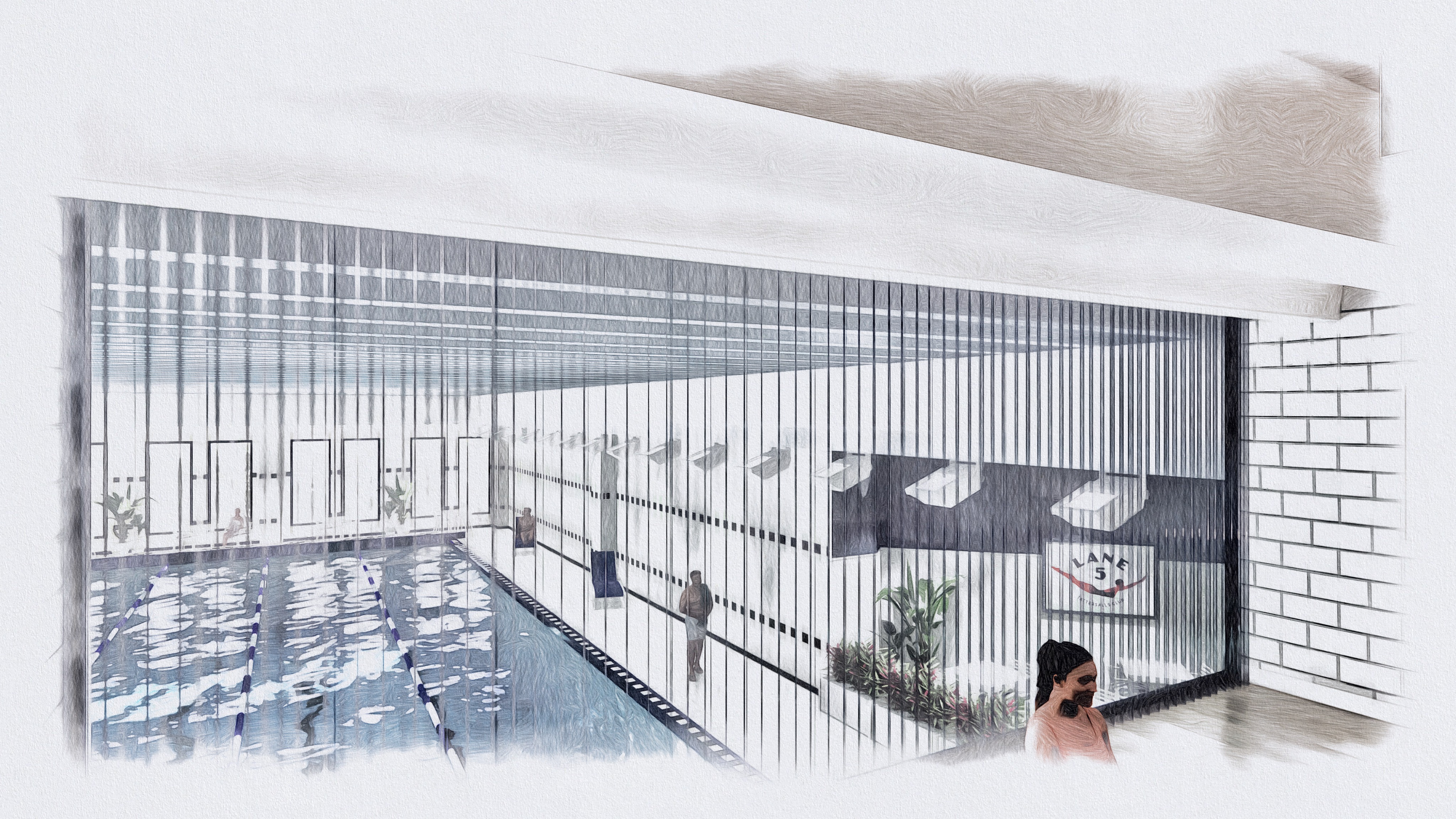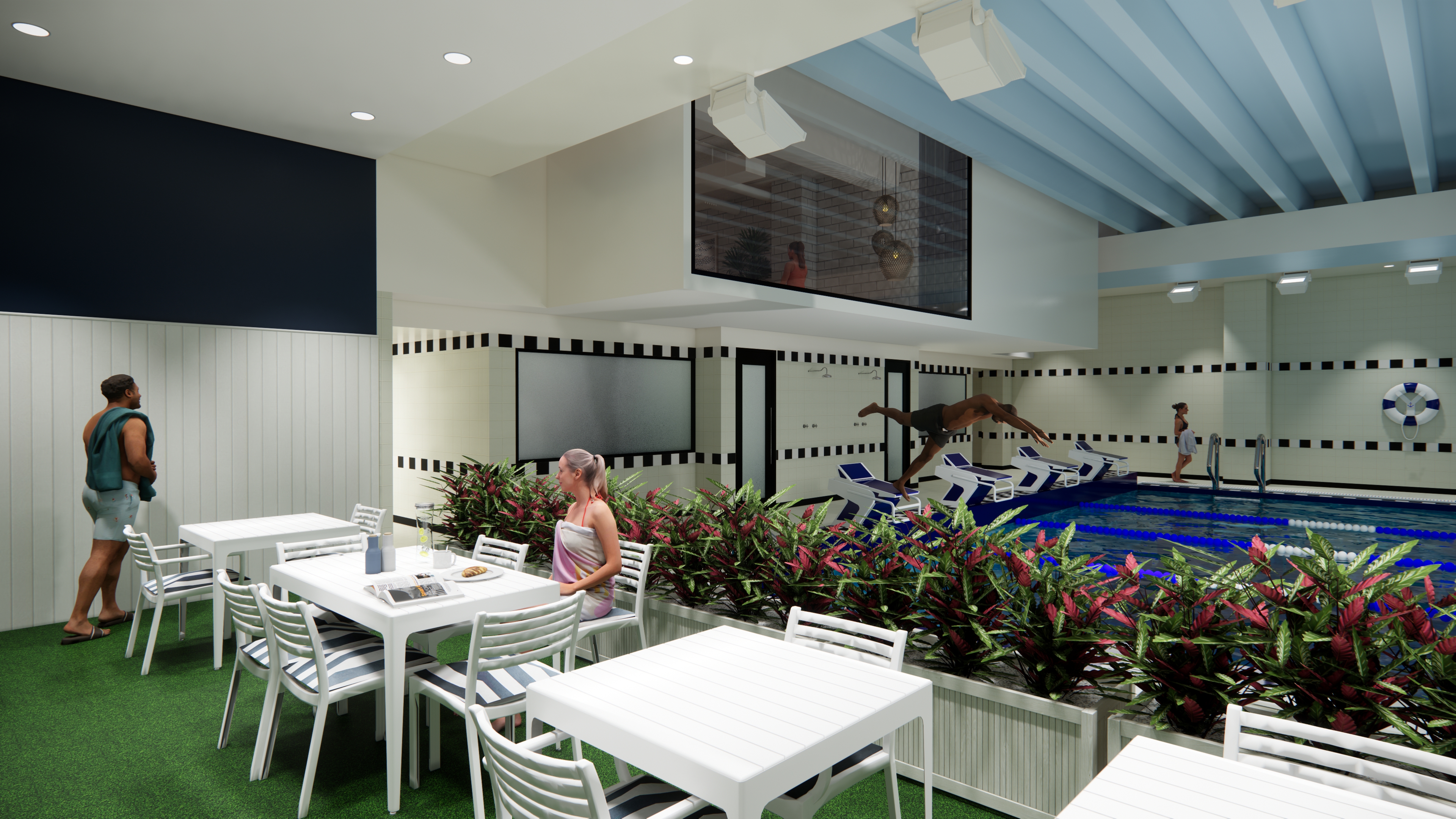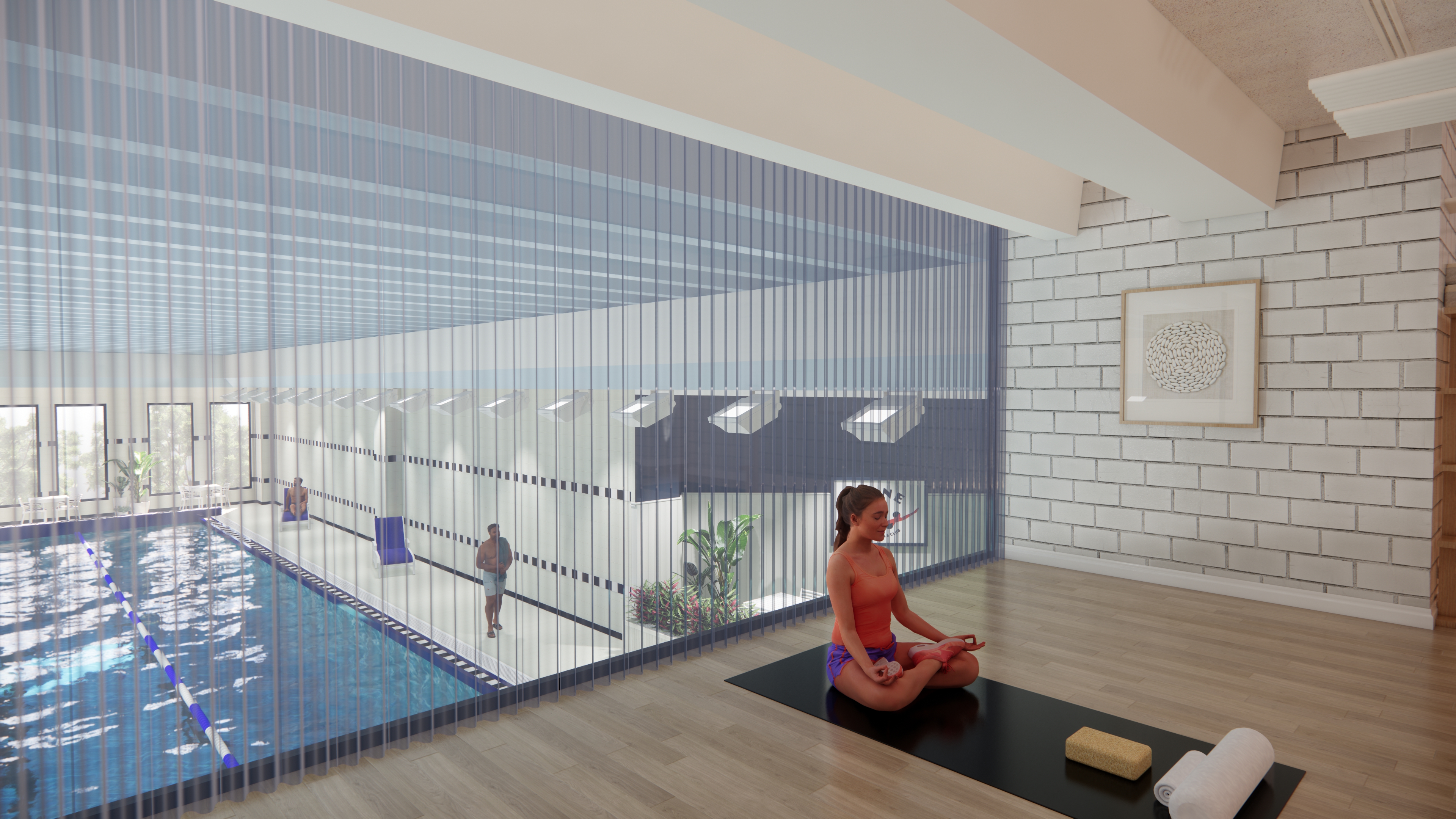 The finishes are materials found in the industrial landscape, mixed with timber and soft furnishings to provide a relaxing space to unwind with yoga and Pilates. The design is connected through biophilia overlooking Hyde Park, Lane 5 Café, and the swimming pool below. Texture is added through raw finishes, white-washed walls, warm timber and an exposed ceiling. The use of sheer curtains softens the hard surfaces, which is open and multi-functional. Great for any event!